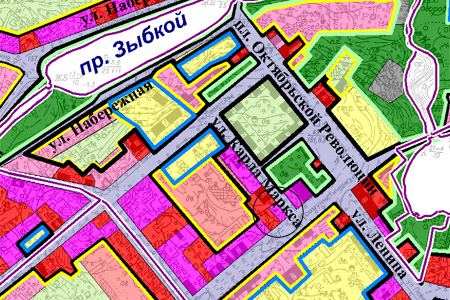 Красным цветом выделены зоны памятников, фиолетовым — охранные зоны, розовым и светло-фиолетовым — зоны регулирования застройки. В центре области, обведенной кружком — территория сквера-магазина.