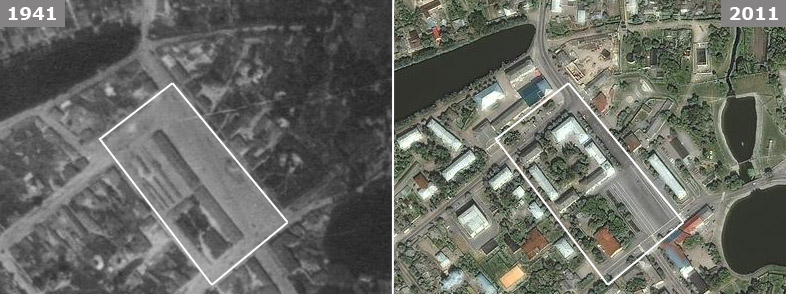 Аэрофотоснимки центральной площади 1941 и 2011 гг. Первоначальные границы площади выделены белой рамкой